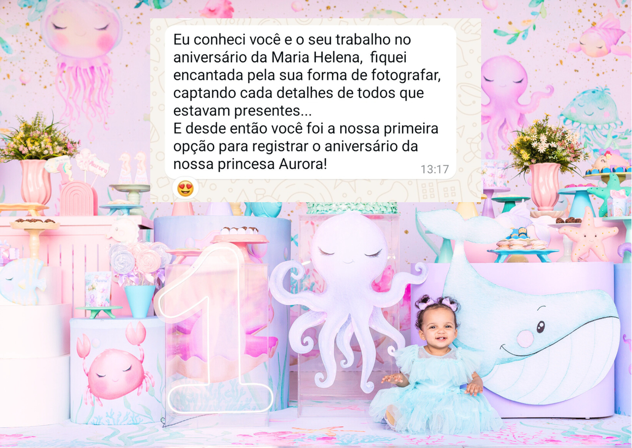 Quatro horas passam voando, e nada mais justo do que aproveitar cada segundo. Por isso, além dos registros tradicionais, tenho verdadeira paixão por capturar momentos espontâneos do aniversariante, da família e dos convidados — aqueles que revelam a essência da celebração e espontaneidade.